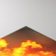 Un pelícano sobre una silueta de playa frente a un incendio en el horizonte