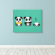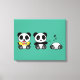 Tres adorables pandas sentados uno al lado del otro. Un feliz panda está usando una camiseta con "I heart panda" escrita en ella. Otra es ofrecer un palo de bambú verde a un tercer panda que se ha quedado dormido.