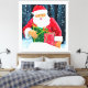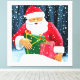 Un père Noël souriant sous la neige, les bras chargés de cadeaux.