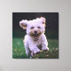 Carrera de caniche blanco perro perro canto Adorable canto en la hierba verde. Pieles blancas de rizo con un perro feliz que podrías simplemente cogerte en tus brazos.
