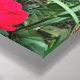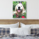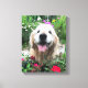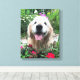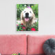 ¡Añade un poco de felicidad dorada a tu casa! Esta impresión de lienzo muestra una fotografía de un lindo y sonriente perro recuperador de oro que está afuera entre flores rojas salvajes.