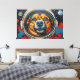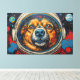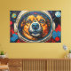 Esta vibrante obra de arte presenta un cautivador primer plano de la cara de un perro, enmarcada dentro del visor transparente del casco de un astronauta. Representado con pinceladas audaces y texturizadas en una paleta dinámica de naranjas, azules y rojos, la expresiva mirada del canino se encuentra con el espectador. El fondo se despliega en una extensión cósmica estilizada, que presenta planetas distantes y formaciones dispersas similares a nebulosas, todo representado con un efecto táctil, casi impasto. El detallado intrincado del pelaje y el casco contrasta con los elementos enérgicos y abstractos del espacio circundante, creando una narrativa visual impactante.