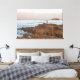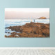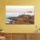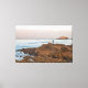 La imagen muestra a dos pescadores parados en una costa rocosa, pescando en el océano. Las rocas son marrones y escarpadas, con pequeñas olas que se estrellan contra ellas. El océano es una mezcla de azul y verde, con una pequeña isla a lo lejos. El cielo está cubierto de una capa de niebla que crea un ambiente tranquilo y silencioso.