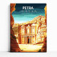 Petra, Jordan in a bold travel poster style featuring the Treasury carved into rose sandstone cliffs. Warm desert tones bring a grounded, museum-like look to a living room, office, entryway, or reading nook. A strong gift for travelers, history lovers, archaeology fans, Jordan souvenirs. Pair it with other destination canvases in your Travel Poster Canvas collection.