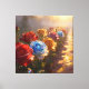 Ein zauberhafter Gartenweg, gesäumt von prachtvollen, taufrischen Rosen in Rot, Gelb, Rosa und Violett, die im goldenen Licht der aufgehenden Sonne leuchten. Diese Szene symbolisiert Frieden, Schönheit und die Magie der Natur – ein Ort zum Träumen und Verweilen.
