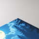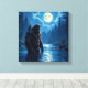 Arte de pie de playa. Un Sasquatch con una lechuza en el hombro mientras viaja a través de un río en un bosque bajo la luna llena.