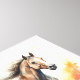 La pintura acuarela representa un majestuoso caballo galopando a través de un amplio campo de flores vibrantes y coloridas. El caballo es capturado a mitad de camino con su forma y su cola fluyendo por el viento, dando la impresión de velocidad y libertad. Las flores en el campo son una mezcla de amarillos, naranjas, rosados y azules, con los tallos verdes que se balancean en la brisa. La pintura evoca un sentido de energía y de vida, y el caballo parece estar disfrutando de su recorrido desinhibido por el paisaje natural. El uso de acuarela aumenta la luminosidad y la calidad de la pintura. Los colores se combinan a la perfección y crean un efecto de ensueño casi etéreo.