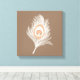 Lienzo envuelto en un dibujo vectorial de una pluma de pavo real, realzado y representado en un suave efecto crayón de conte - plumas blancas, con ojo blanco, de melocotón y de taupe, sobre un fondo medio de color marrón