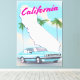 Poster de Vacaciones al estilo de los Vintage de California con un viejo auto de estilo de los años 80 con un telón de fondo de palmeras en la noche y un mapa del estado.