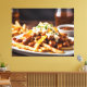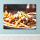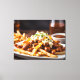 Un plato de Poutine con patatas fritas, queso y salsa.
