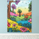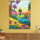 This is a vibrant and dynamic painting that portrays a lush, storybook-like landscape. The artwork features bold, black outlines that define every element, giving it a graphic novel aesthetic. Towering, sturdy trees with textured brown trunks dominate the scene; some bear bright green foliage, while others are adorned with rich purple leaves, suggesting a fantastical forest.
