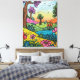 The background unfolds with rolling hills depicted in distinct bands of vivid greens, oranges, and pinks, creating a layered and almost quilted appearance. A flowing blue body of water meanders through the midground, its surface reflecting a bright, almost iridescent quality.