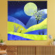 Un paisaje abstracto que representa colinas onduladas con un florido árbol primaveral y plantas y una luna y estrellas en tonos azules, cian, amarillo y rosa.
