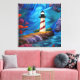 Hermoso faro de rayas rojas y blancas sobre un rocoso en el exterior rodeado de flores y agua azul/cielo Arte de IA creado por minx267