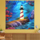 Hermoso faro de rayas rojas y blancas sobre un rocoso en el exterior rodeado de flores y agua azul/cielo Arte de IA creado por minx267