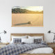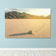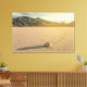 La imagen muestra un paisaje de Racetrack Playa, un lago seco en el Valle de la Muerte, California. Una gran roca se sienta en la superficie seca y rota, proyectando una larga sombra. Detrás de la roca, un sinuoso sendero recorre la playa. En el fondo, las montañas se levantan contra un cielo con nubes dispersas. La escena está bañada por una luz cálida y dorada que crea una atmósfera serena y misteriosa.
