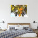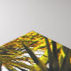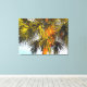 En un ambiente tropical, la fotografía original de MaeFlowers en esta Impresión de tela envuelta muestra la parte superior de una palmera con sus ramas y el tronco bañado en el cálido resplandor del sol de la tarde. Las ramas largas y puntiagudas en el fondo son de color verde oscuro, y se extienden como fans. Las ramas en primer plano son de color amarillo claro, curvándose hacia el exterior mientras captan la luz del sol. El tronco del árbol, normalmente de color marrón medio, parece casi naranja a última hora de la tarde. Un fondo azul pálido del cielo azul acuático separa los ricos tonos tierra de la palmera y completa la escena tropical.