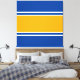 Este diseño deportivo presenta amplias rayas horizontales de carreras de color amarillo dorado y blanco con un fondo azul claro y colorido.