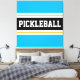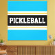Este divertido diseño deportivo incluye letra en negrita PICKLEBALL en el interior de una banda negra central ancha realzada con rayas de carreras doradas amarillas y blancas contra rayas exteriores brillantes azul cielo.