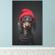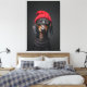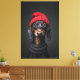 Un encantador dachshund tiene una abeja roja y un acogedor suéter marrón. Los ojos expresivos y la postura atenta del perro se suman al atractivo encantador y caprichoso de la fotografía.