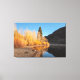 Un paisaje tranquilo captura un lago tranquilo con el telón de fondo de una colina boscosa. La superficie del agua refleja los tonos vibrantes del follaje otoñal, mostrando una mezcla de hojas doradas amarillas y naranjas. En la orilla del lago se encuentra un árbol alto y verde que añade un elemento de contraste a la escena.