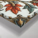 Ceramic tile art featuring two deer facing each other, with orange leaves and blue foliage in the background, symmetrical composition, the deer are light brown with large antlers, the leaves are a vibrant orange, and the foliage is a deep blue, the background is white, the art style is reminiscent of Art Nouveau.