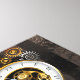 Diales antiguos con artes de oro y latón, decorados con libélula mecánica sobre fondo marrón, rayado. Steampunk.