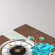 Reloj de época con estampado, adornado con joyas, manos de la hora de oro y números latinos con rosas turquesa sobre fondo marrón y rayas. Estilo Steampunk.