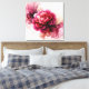 Una flor de peonía, vibrante y detallada, con pétalos rosas y rojos exuberantes, está rodeada de un suave y fluido patrón acuático
