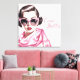 Esta obra de arte cuenta con una elegante mujer con gafas de sol rosas y una bufanda que capta un estilo de moda minimalista y vintage. Se coloca ligeramente a la izquierda sobre un fondo blanco, lo que mantiene la atención en ella. La frase "Ciao Bella" en escritura rosa agrega un toque retro y juguetón al diseño simple y elegante.
