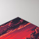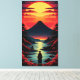 Una silueta solitaria se yergue junto a un río brillante, frente a un volcán imponente bajo un dramático atardecer rojo-naranja. El follaje rojo intenso enmarca la escena, fusionando el poder de la naturaleza con una belleza serena y surrealista.