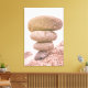 Una pila de cuatro piedras suaves y grises se balancea cuidadosamente en una roca más grande y texturada. Las piedras están dispuestas en forma de pirámide, con la piedra más grande en la parte superior y la más pequeña en la parte inferior. El fondo es una imagen suave y borrosa de una playa con un cielo azul y rosa claro. La imagen ofrece un ambiente tranquilo y sereno, lo que sugiere un sentido de equilibrio y tranquilidad.