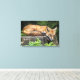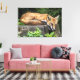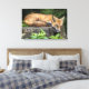 Un zorro rojo usa un viejo trozo de árbol como un lugar para descansar en el borde del bosque.