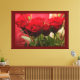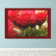 El lienzo presenta una rosa roja vívida con hojas verdes y exuberantes sobre un rico fondo rojo oscuro. Los tonos profundos del fondo realzan el color vibrante del rosa, creando un efecto visual llamativo y elegante. Esta obra de arte es perfecta para añadir un toque atrevido y sofisticado a cualquier habitación.