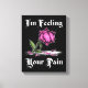 Este diseño de flor presenta una simple rosa rosa solitaria marchitándose en desesperación con las palabras, “Siento tu dolor”, en tipografía sombría. Algunas personas pueden sentir el dolor de los demás, pero las palabras por sí solas no siempre lo expresan. Esta es una forma de expresar visualmente tu angustia por la desesperación de los demás. Este diseño es para cualquiera que sea visualmente poético o simplemente esté de humor melancólico.
