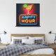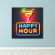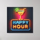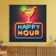 Luces de neón brillantes muestran el mensaje "Happy Hour" y un cóctel gráfico en un fondo de pared de ladrillo