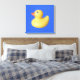 Fotografía de un pato amarillo de goma sobre fondo azul.