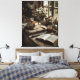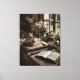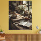 Sunlight streams through an old window onto a weathered wooden table laden with a crusty sourdough loaf, a slice ready to eat, and a glass jar of rich amber jam. An open antique book, fresh daisies in a vintage vase, dried wheat stalks, and soft linen details complete this timeless farmhouse kitchen still life. Warm, inviting, and full of nostalgic charm, the scene feels like a peaceful morning in a countryside cottage—ideal for kitchen wall art, canvas prints, aprons, mugs, tea towels, cutting boards, and cozy home décor that celebrates simple rustic pleasures.