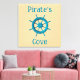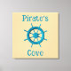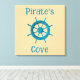 Premium Wrapped Canvas wall hanging decor with a fun customizable template text typography Pirate's Cove and printed with Rustic Weathered Boat Steering Wheel Photo Image with a summer tan sand background and turquoise colors is part of our always expanding original photography collections by TheFabricSeal print on demand shop at Zazzle.com #ZazzleMade ©️Original. https://www.zazzle.com/store/thefabricseal
