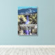Un paisaje digital de la pintoresca Vermont. La montaña Stowe se eleva sobre las Cataratas del Glen de Moss, con un cielo azul claro como fondo. A medida que el agua fría se apresura para bajar bajo un puente cubierto, termina en las Cataratas Warren. Hay un borde negro alrededor de la obra de arte. En una letra blanca está "Vermont", "Beautiful Route 100". Y pueden encontrar el año de la condición de estado en los paseos puente, que parecen un 1791 tallado. A la entrada del puente hay un pavo vigilante. Derechos reservados ©2023 Kimberly J Tilley.