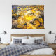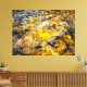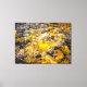Una fotografía de primer plano captura una corriente de agua que fluye sobre un lecho de hojas de otoño vibrantes. Las hojas están parcialmente sumergidas, sus bordes brillan con luz que refleja la superficie del agua. El agua es clara y burbujeante, lo que crea una sensación de movimiento y energía. El ambiente es sereno y tranquilo, evocando una sensación de tranquilidad y la belleza del ciclo natural.
