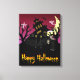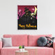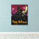 Ilustracion de la aterradora escena de Halloween con el pañuelo oscuro sosteniendo un cráneo frente a una vieja casa embrujada.