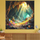 Tief verborgen in einer geheimnisvollen Höhle leuchten unzählige Goldmünzen und Schatztruhen im Licht der Sonnenstrahlen, die durch eine Öffnung in der Decke dringen. Eine Szene wie aus einem Märchen – reich an Magie, Abenteuer und uralten Geheimnissen.