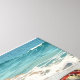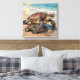 Coastal themed wrapped canvas wall art with an illustration of a mama sea turtle and baby crawling into the blue ocean waves on a sandy beach.