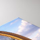A mirror resting on sand reflects a snowy landscape beneath a summer sky.