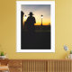 This artistic photograph captures the magical essence of sunset in Salvador, Bahia. The image features an imposing female silhouette wearing a wide-brimmed hat, framed by the golden glow of the setting sun on the horizon of Tomé de Souza Square. Two classic lampposts add a touch of urban elegance and nostalgia to the scene, while the colors of the sky smoothly transition from vibrant orange to the deep blue of twilight. It is a work that evokes feelings of contemplation, peace, and the timeless beauty of Northeastern Brazilian culture. Perfect for those seeking a decorative piece that combines mystery, sophistication, and the warmth of tropical light.