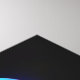 Símbolo de infinito violeta y brillante con colibrí azul sobre fondo negro. Neón.