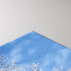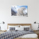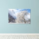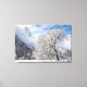 Un paisaje cubierto de nieve con un gran roble de ramas desnudas en primer plano. El árbol está muy cargado de nieve, sus ramas se extienden hacia el espectador. En el fondo, se eleva una cordillera, cubierta de bruma y nubes. El cielo es azul brillante, con nubes blancas esparcidas a través de él. El lugar es tranquilo y sereno, con un sentimiento de tranquilidad y soledad.
