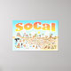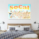 Una escena luminosa y colorida ofrece una vista espectacular del sur de California - personajes extravagantes de los parques de playa y desierto de SoCal que exhiben Los Ángeles, Long Beach, San Diego, Santa Barbara, Riverside, Palm Springs, Anaheim, Anza Borrego y Joshua Tree, así como las ciudades fronterizas de Tijuana, Tecate y Mexicali. Esta encantadora escena lo tiene todo: un surfista cuelga diez mientras una sirena se alza sobre una roca, una ballena asesina salta del agua, animales del zoo saludan a los turistas, una pareja de playa muscular flexa para impresionar mientras un T-Rex ruge un desafío y un tanque se mueve en posición y mucho más...