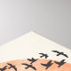 Una bandada de pájaros colocada frente a un sol rojizo sobre un fondo beige.
